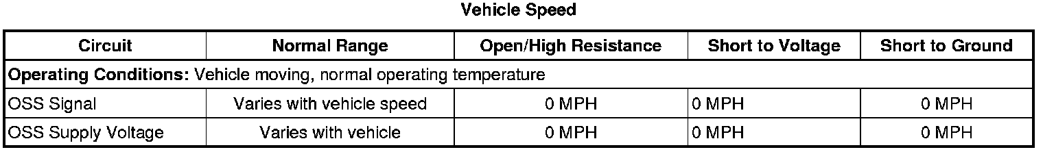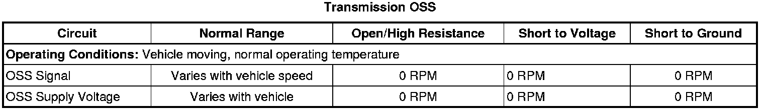 1. Operate the vehicle at 16-32 km/h (10-20 mph), observe the scan tool Transmission OSS parameter. The reading should be greater than 150 RPM and not drop out.