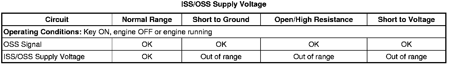 1. Ignition ON, verify with a scan tool the transmission ISS/OSS supply voltage test status parameter displays OK.