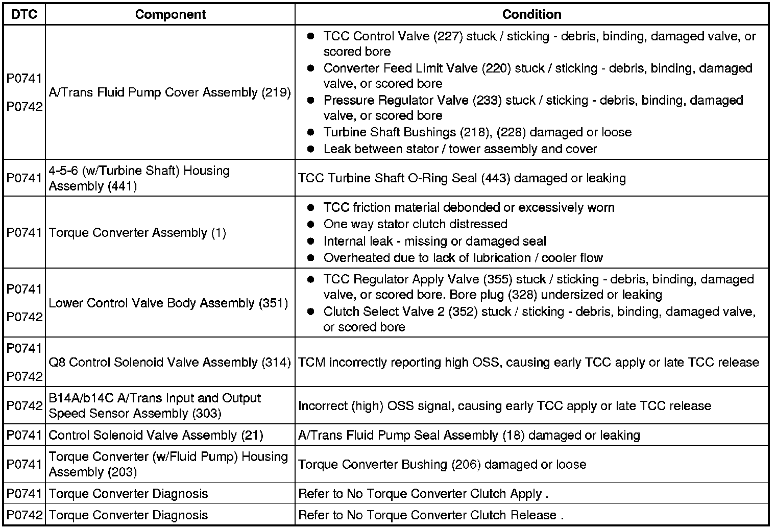 4. Listed in the chart below are conditions for each component that could set DTC P0741 or P0742. Carefully inspect each component for that condition. Repair or replace as necessary.