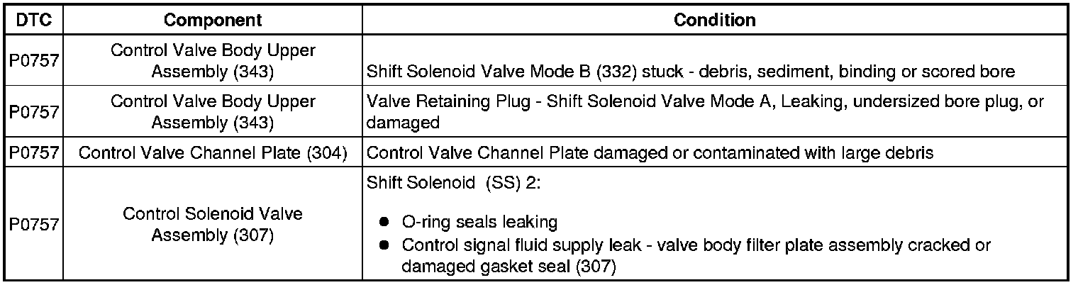 8. Listed in the chart below are conditions for each component that could set DTC P0757. Carefully inspect each component for that condition. Repair or replace as necessary.
