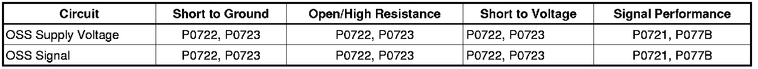 The electronics in the sensor combine the two signals and send a signal with a different pulse width. This signal is interpreted by the transmission control module for speed and direction and is transmitted through the serial data circuits to the engine control module (ECM) and the hybrid powertrain control module. The ECM, hybrid powertrain control module, and transmission control module compare the OSS signal with the anti lock brake system wheel speed sensor signal. The hybrid powertrain control module also compares the output shaft direction with the drive motor 1 and drive motor 2 direction.