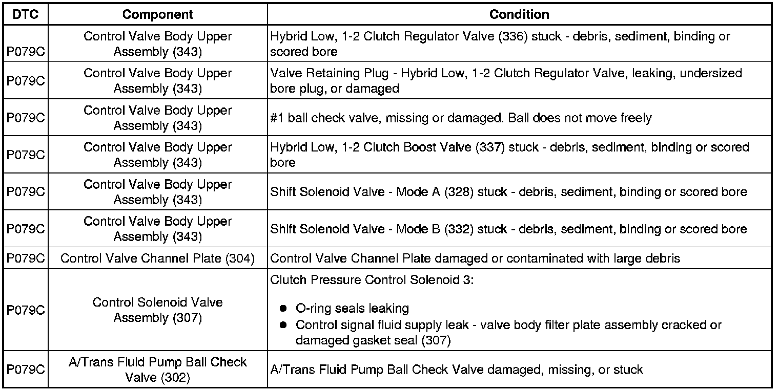7. Listed in the chart below are conditions for each component that could set DTC P079C. Carefully inspect each component for that condition. Repair or replace as necessary.