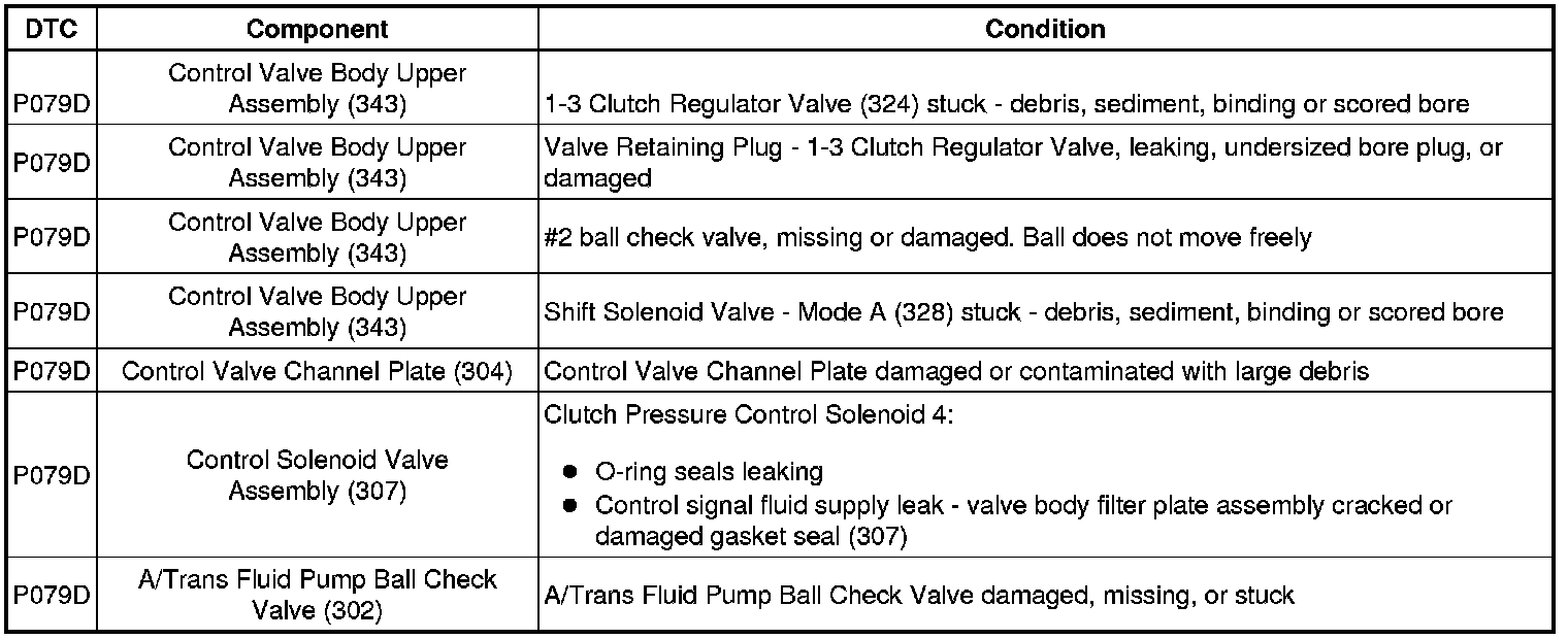 7. Listed in the chart below are conditions for each component that could set DTC P079D. Carefully inspect each component for that condition. Repair or replace as necessary.