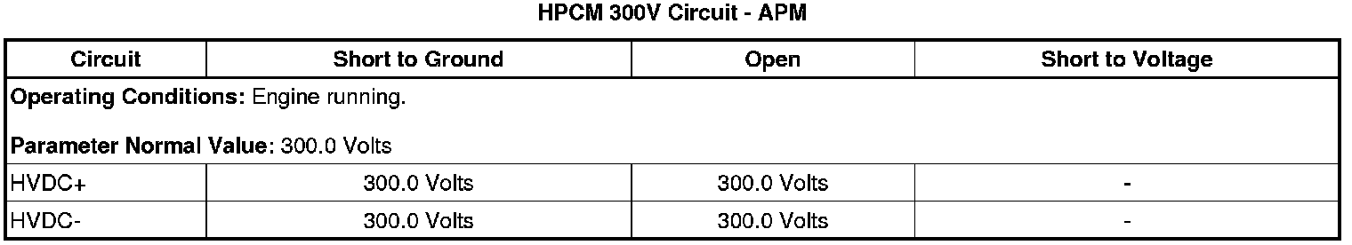 2. Engine running or autostop, observe the scan tool accessory DC power control module (APM) HPCM 300V Circuit parameter. The reading should be between 225 V and 380 V.