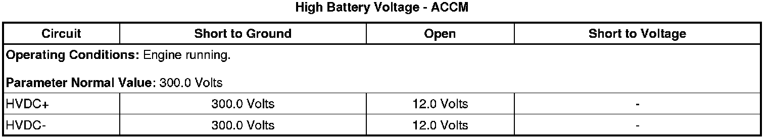* The DTC will pass when the ACCM detects a hybrid battery voltage greater than 201 V for 3 seconds.