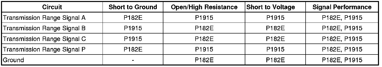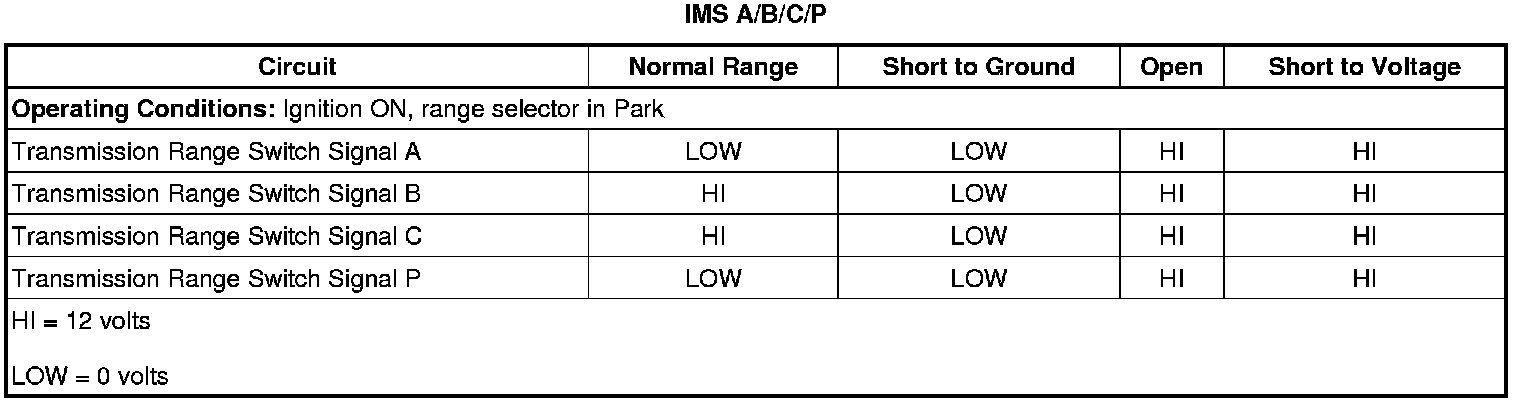 The manual shift detent lever with shaft position switch assembly or internal mode switch (IMS) assembly is a sliding contact switch attached to the control valve body within the transmission. The 4 inputs to the transmission control module (TCM) from the switch indicate which position is selected by the transmission manual shaft. The input voltage at the TCM is high when the switch is open and low when the switch is closed to ground. The state of each input is displayed on the scan tool as IMS. The IMS input parameters represented are transmission range signal A, Signal B, signal C, and signal P.