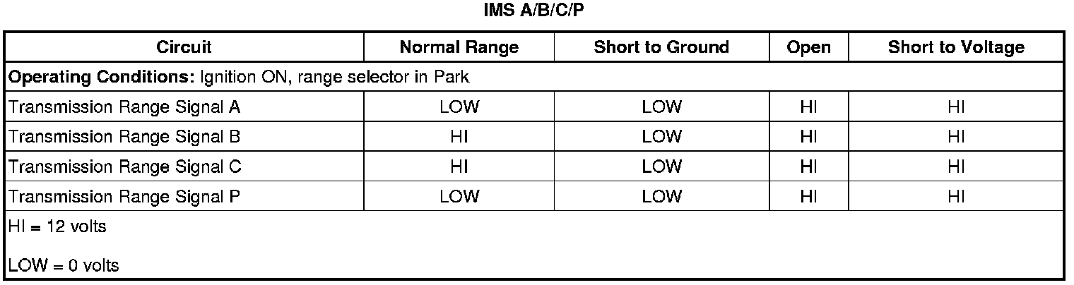 * The IMS signal circuit A, B, or P are Low in Park for greater than 8 seconds.