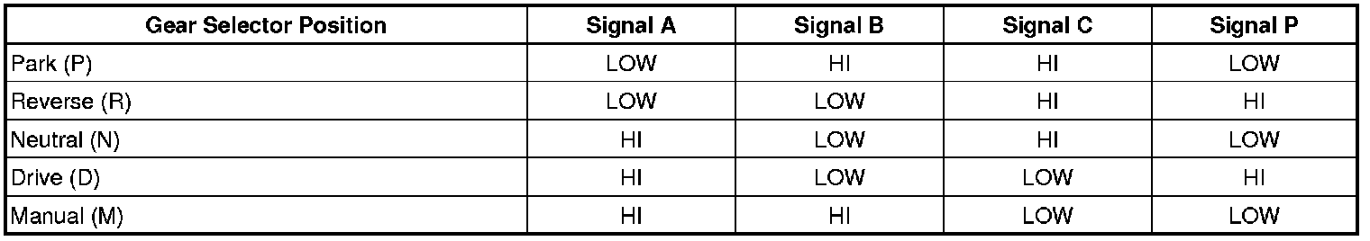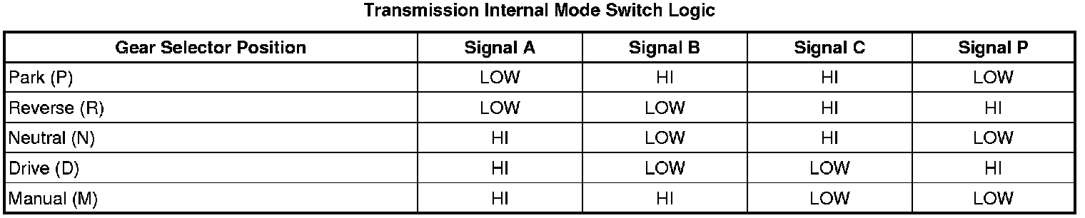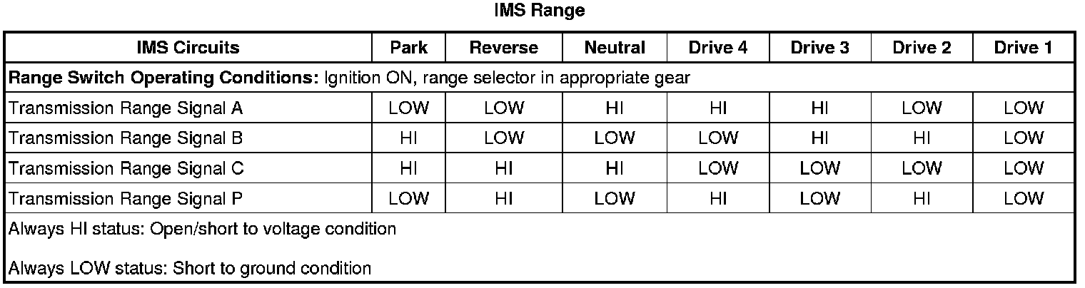 The automatic transmission manual shift shaft position switch assembly, also called the transmission internal mode switch assembly, is a dual sliding contact switch attached to the control valve body within the transmission. The 9 outputs from the switch indicate which position is selected by the transmission manual shaft. Four outputs (A, B, C, P) are range selection inputs to the transmission control module (TCM). Five outputs (R1, R2, D1, D2, S) are direction selection inputs to the hybrid powertrain control module. The input voltage at the modules is high when the switch is open and low when the switch is closed to ground. The state of each input is displayed on the scan tool as IMS Range and IMS Direction. The IMS Range input parameters represented are transmission range signal A, signal B, signal C, and signal P. The IMS Direction input parameters represented are transmission direction signal R1, signal R2, signal D1, signal D2, and signal Start.