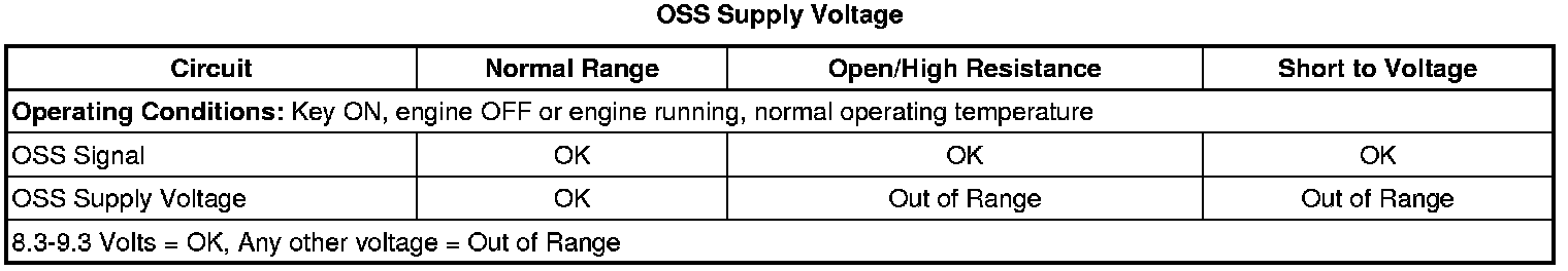 The output speed sensor (OSS) assembly has 2 internal hall-effect type sensors, and is capable of sensing both speed and direction. The OSS mounts to the A/T rear case assembly and is connected to the control solenoid (w/body and TCM) valve assembly through a wire harness and connector. The sensor faces the hybrid direct, 2-3-4 clutch housing assembly machined teeth surface. The sensor receives 8.3-9.3 volts on the OSS supply voltage circuit from the transmission control module (TCM). As the output shaft rotates, the sensor produces a signal frequency based on the machined surface of the output shaft.