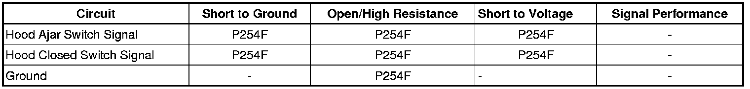 The engine control module (ECM) monitors the voltage input of the hood open switch signal circuit and the hood open closed switch signal circuit. With the hood open, the hood ajar portion of the switch is closed, grounding the hood ajar switch signal circuit from the ECM, and the hood closed portion of the switch is open. With the hood closed, the hood closed portion of the switch is closed, grounding the hood closed switch signal circuit from the ECM, and the hood ajar portion of the switch is open. During proper operation, the two separate voltage signals at the ECM should never be at the same voltage.