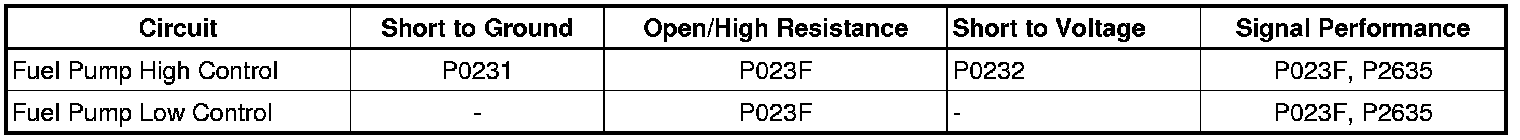 This DTC sets when the fuel pump control module detects a predetermined fuel pressure performance degradation between the desired fuel rail pressure and the current fuel rail pressure.