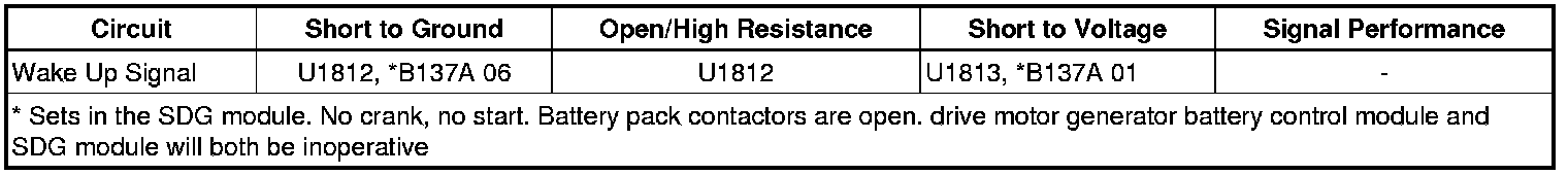 The serial data gateway (SDG) module translates serial data messages between the high speed GMLAN serial data bus, the low speed GMLAN serial data bus, and the high speed hybrid GMLAN serial data bus. Messages between the drive motor generator battery control module and the other hybrid system control modules must pass thru the SDG module. The wake up circuit sends a voltage from the SDG module to the drive motor generator battery control module to initiate certain module functions. DTC U1813 is set by the drive motor generator battery control module, but is stored in and reported by the hybrid powertrain control module (HPCM).