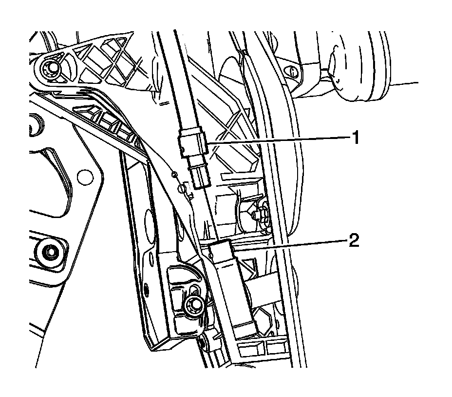 5. Install the drive cable (1) into the accelerator actuator (2) until secured by the secondary locking tabs.