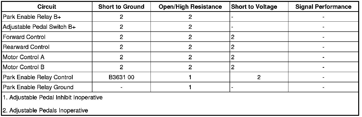 Voltage to the adjustable pedal switch is supplied through the park enable relay while in a de-energized state. The park enable relay is controlled by the body control module (BCM) through a high side drive control circuit and will be energized whenever the ignition is in the accessory, run, or crank positions and the transmission is in reverse or the cruise control is engaged. The adjustable pedals switch controls the adjustable pedals relay by applying battery voltage to one of the coils. In an inactive state both of the relay switch contacts are closed to ground and when one of the relay coils is energized its switch contact is closed to battery voltage.