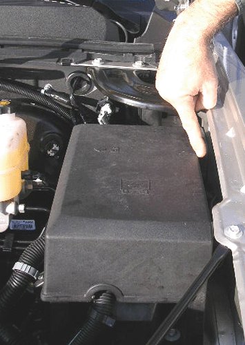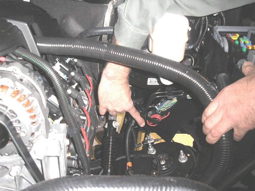 7. After completing the under dash connections to the electric brake controller, open the hood and locate the red wire that is taped to the harness between the underhood electrical center and the driver side front fender.