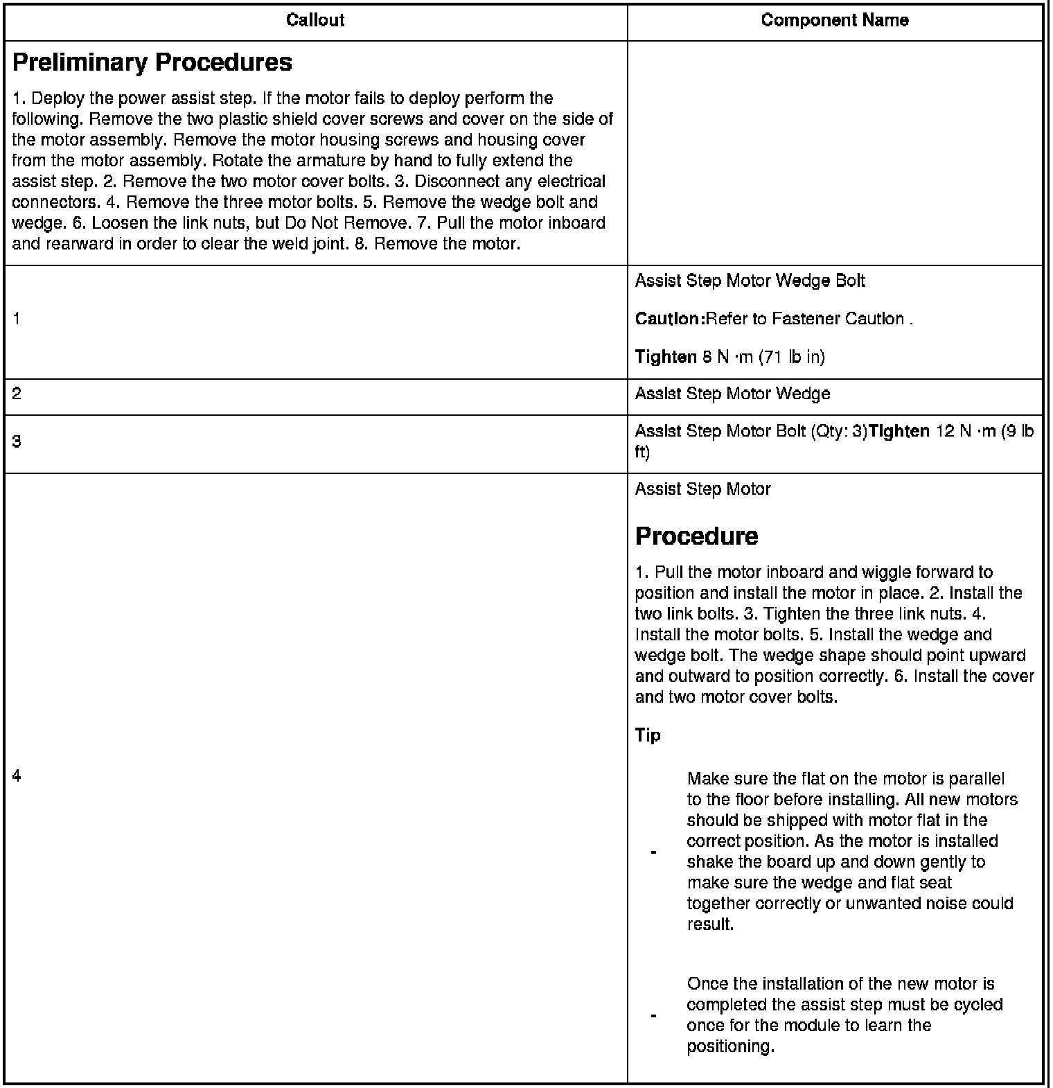 Tip-Make sure the flat on the motor is parallel to the floor before installing. All new motors should be shipped with motor flat in the correct position. As the motor is installed shake the board up and down gently to make sure the wedge and flat seat together correctly or unwanted noise could result.-Once the installation of the new motor is completed the assist step must be cycled once for the module to learn the positioning.