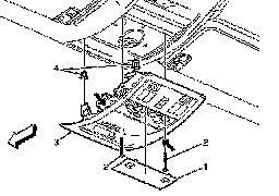 3. Grasp the right and left sides of the roof console assembly (3) (where indicated with arrows above) and pull downward using equal force on each side in order to release the retaining clips (4) securing the console assembly to the headlining assembly.