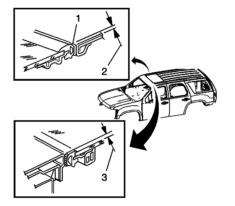 6. Adjust the front of the sunroof window panel to 0.0 - 1.0 mm (0.040 in) below the top surface (3) of the roof panel.