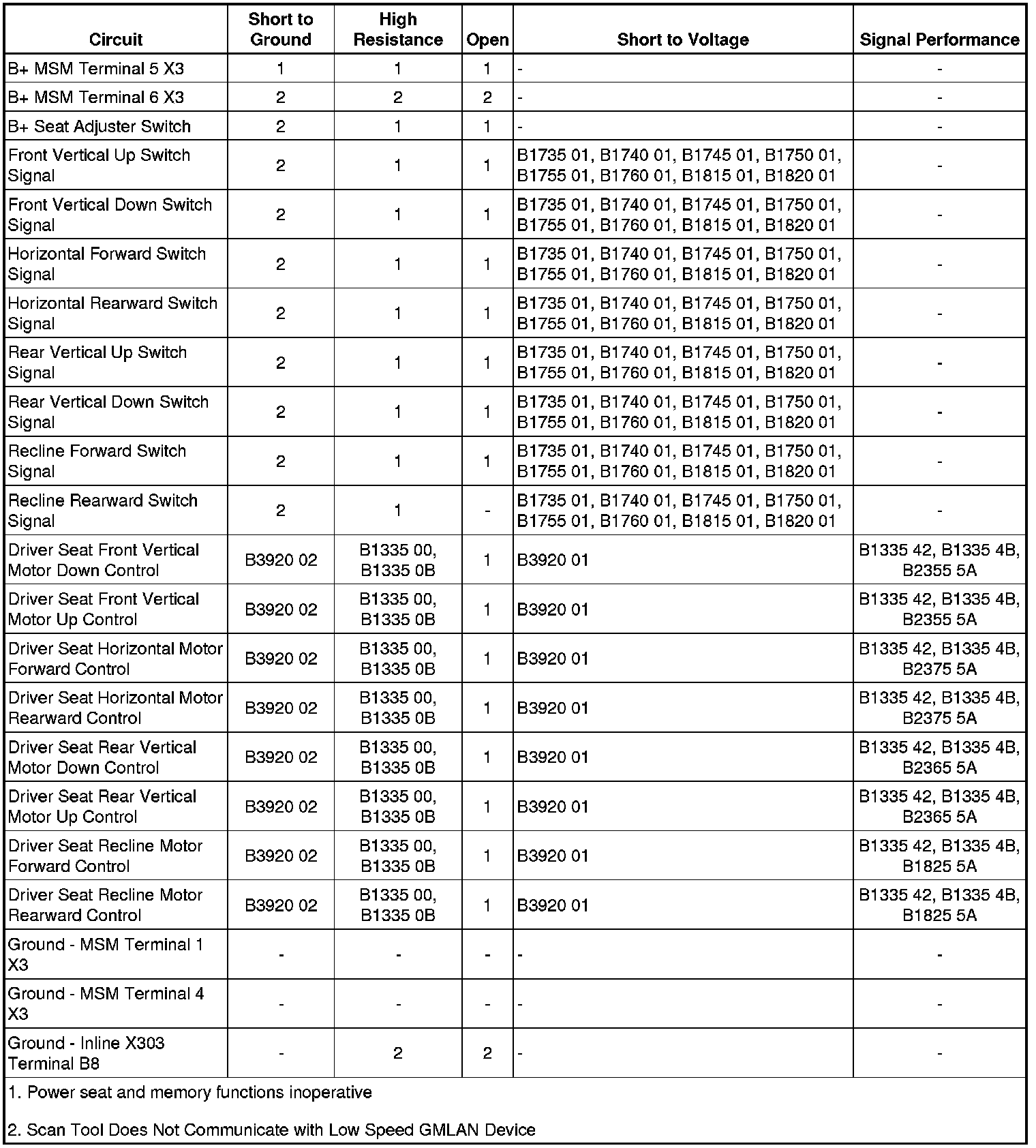 2. If all seat switch inputs to the MSM function normal, refer to the appropriate test listed below: