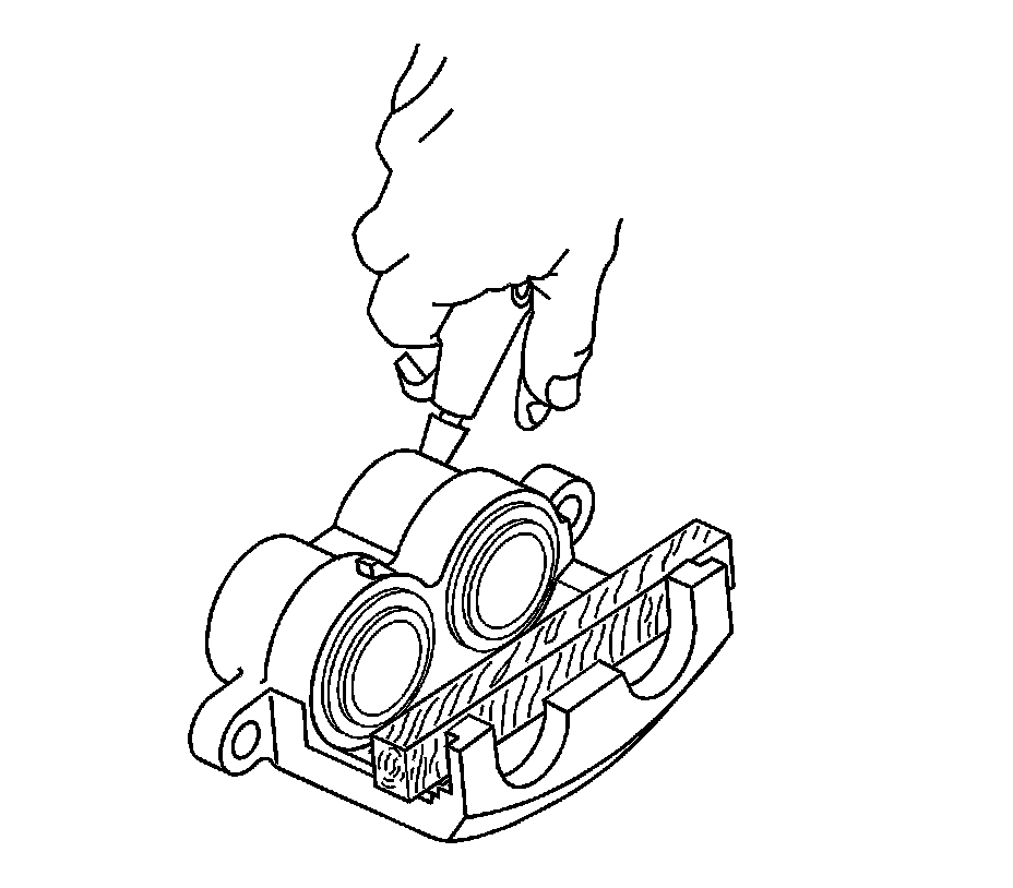 Note: When applying the clean brake fluid to the piston bores, piston seals and pistons, only apply the brake fluid to one bore at a time. This is done to ensure the brake caliper, seals and pistons DO NOT become contaminated with dirt or other foreign material.