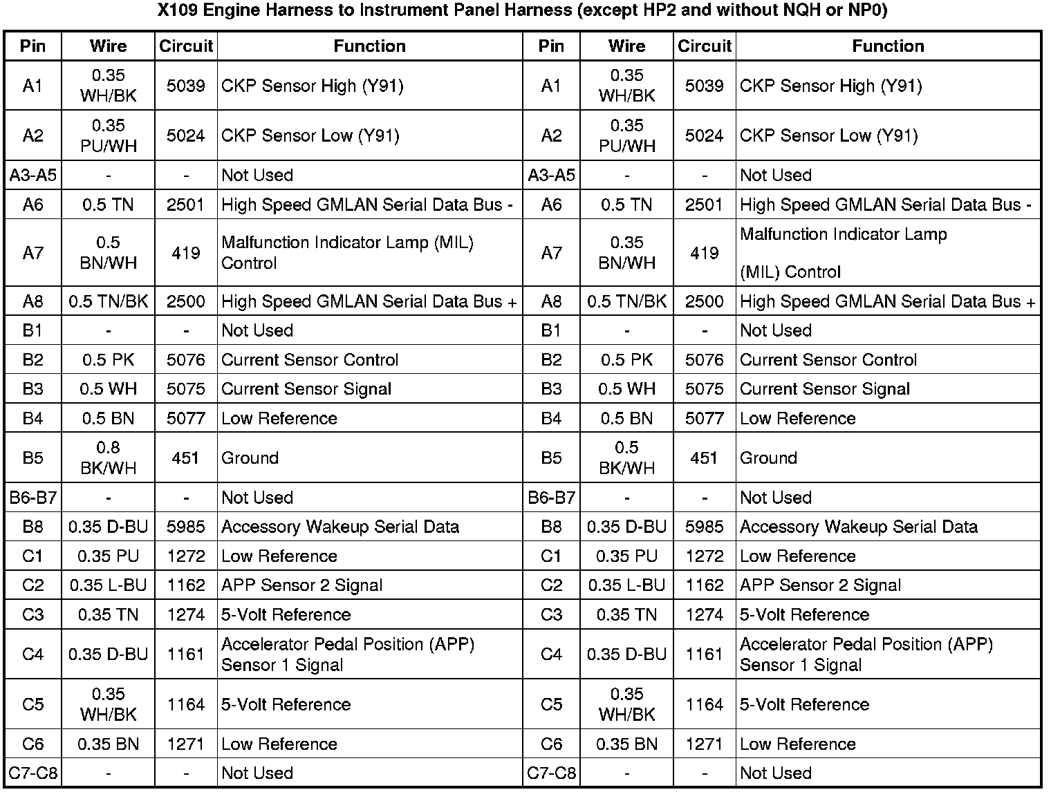 X109 Engine Harness to Instrument Panel Harness (except HP2 and without NQH or NP0)
