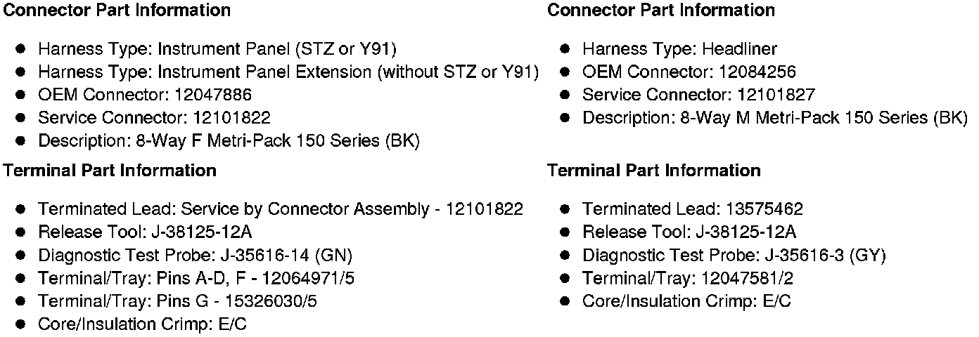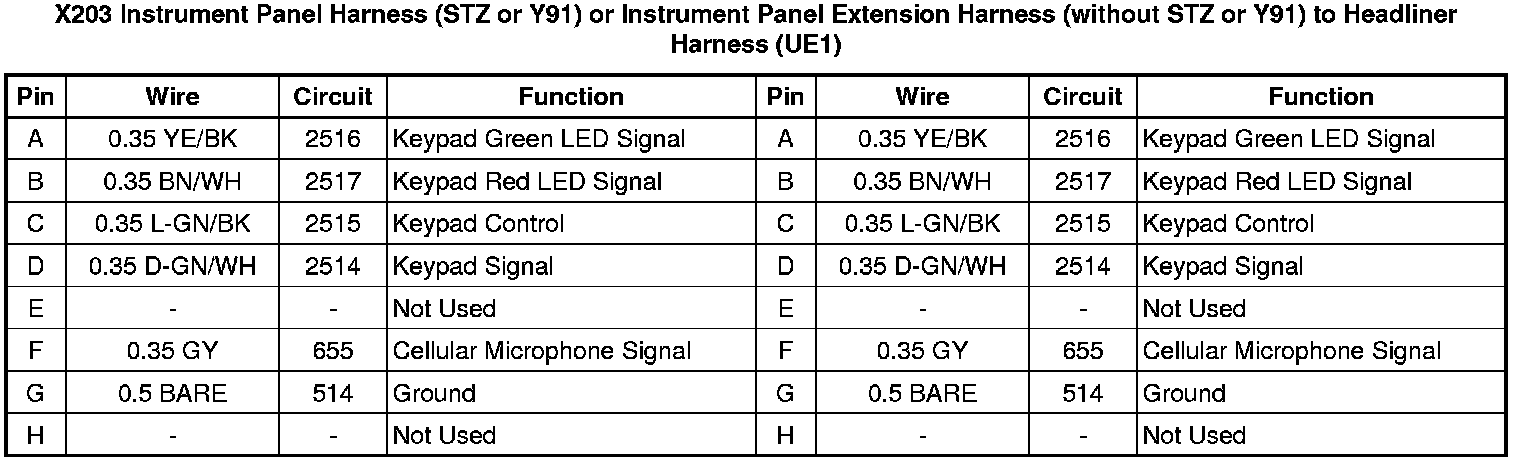 X203 Instrument Panel Harness (STZ or Y91) or Instrument Panel Extension Harness (without STZ or Y91) to Headliner Harness (UE1