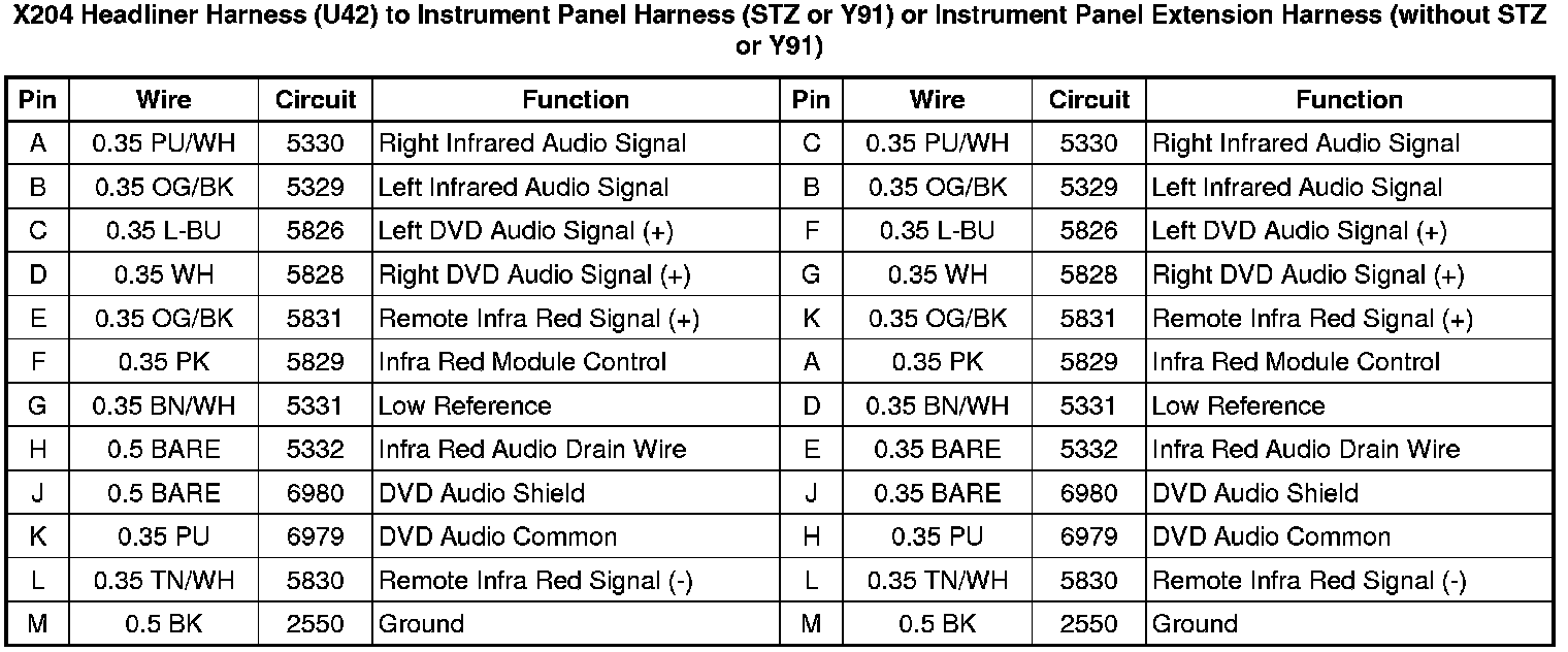 X204 Headliner Harness (U42) to Instrument Panel Harness (STZ or Y91) or Instrument Panel Extension Harness (without STZ or Y91)