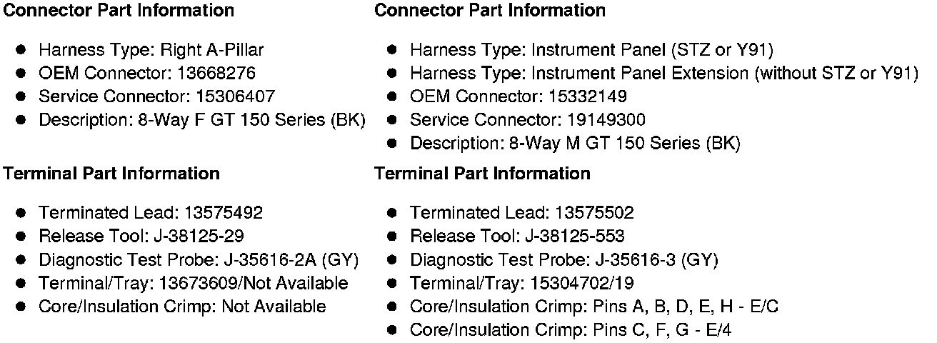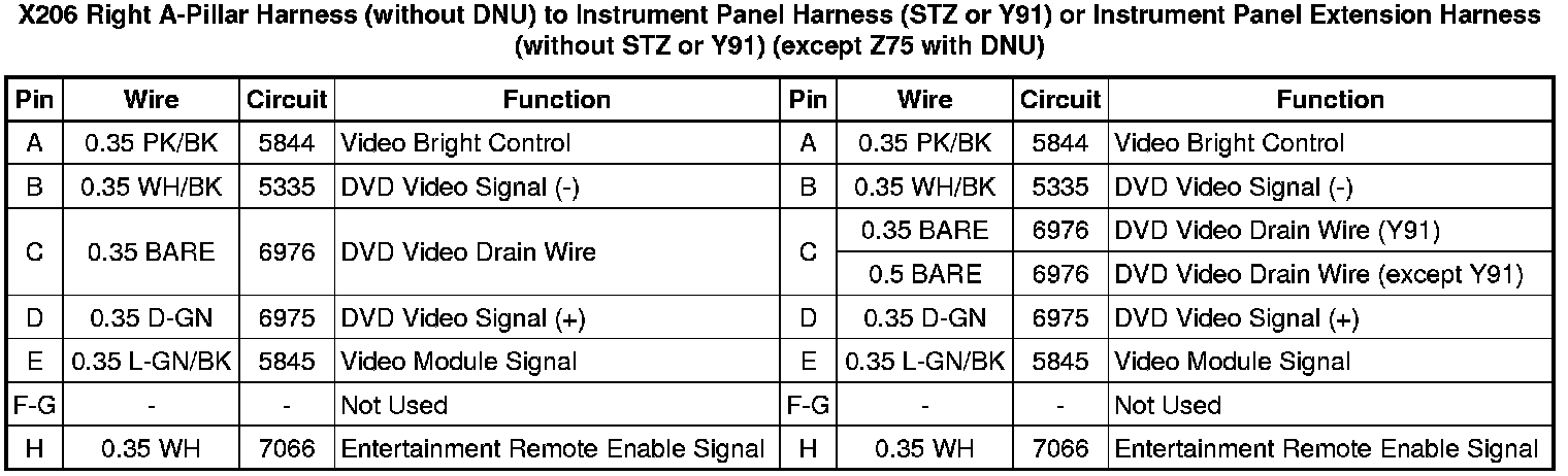 X206 RH A-Pillar Harness (without DNU) to IP Harness (STZ or Y91) or IP Ext Harness (without STZ or Y91) (except Z75 with DNU)