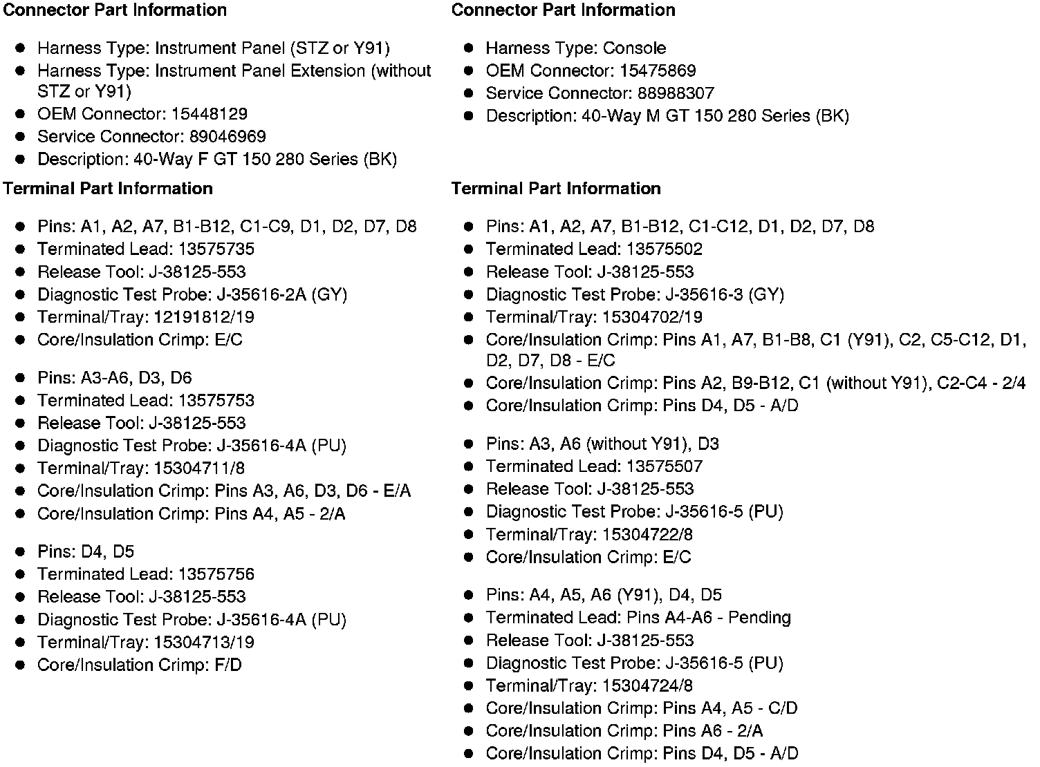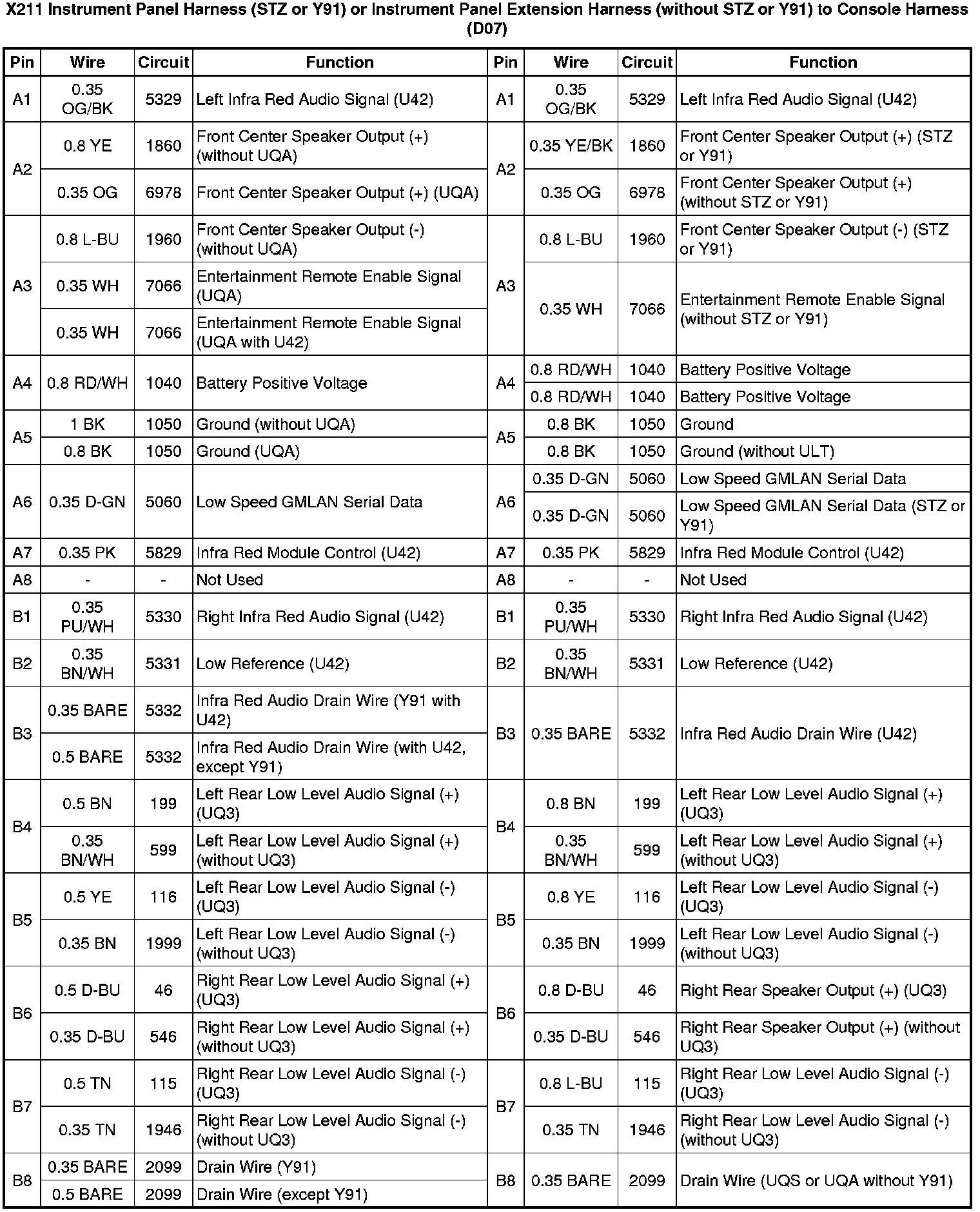 X211 Instrument Panel Harness (STZ or Y91) or Instrument Panel Extension Harness (without STZ or Y91) to Console Harness (D07)