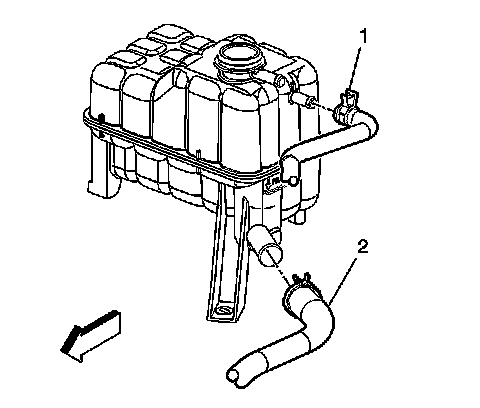 12. Remove the surge tank outlet hose (2) from the surge tank.