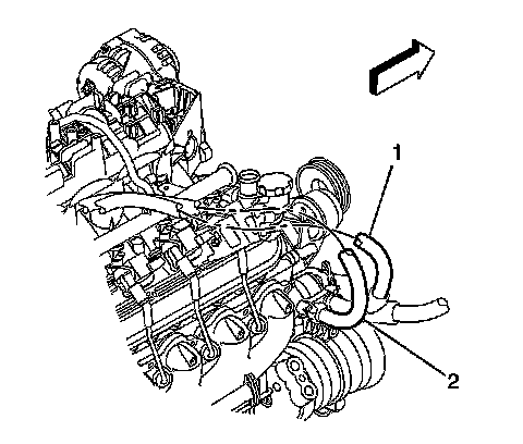 4. If equipped without regular production option (RPO) C36 auxiliary heater, remove the surge tank/heater outlet hose (1) from the mounting clip.