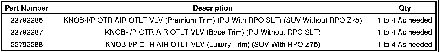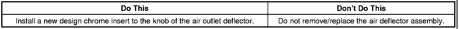 Depending on trim level, order the appropriate insert service part from the part table below and install it to the raised center knob on the air outlet deflector(s). Align the insert and press into place.