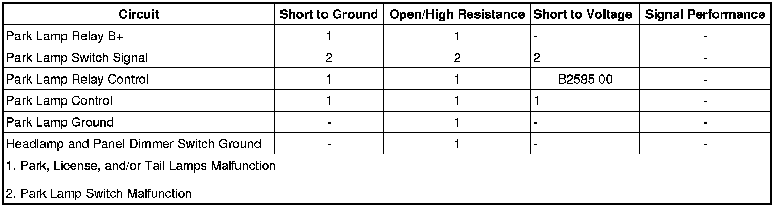 • If the park lamps do not turn ON and OFF when commanded, refer to Park, License, and/or Tail Lamps Malfunction.