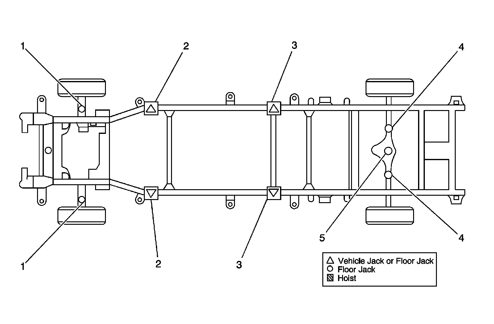 For lifting the vehicle, various lift points are recommended. Before you begin any lifting procedure, place the vehicle on a clean, hard, level surface. Verify that all the lifting equipment meets weight standards and is in good working order. Verify that all of the vehicle loads are equally distributed and secure. If you are only supporting the vehicle at the frame side rails, verify that the lifting equipment does not put too much stress on, or weaken, the frame side rails.