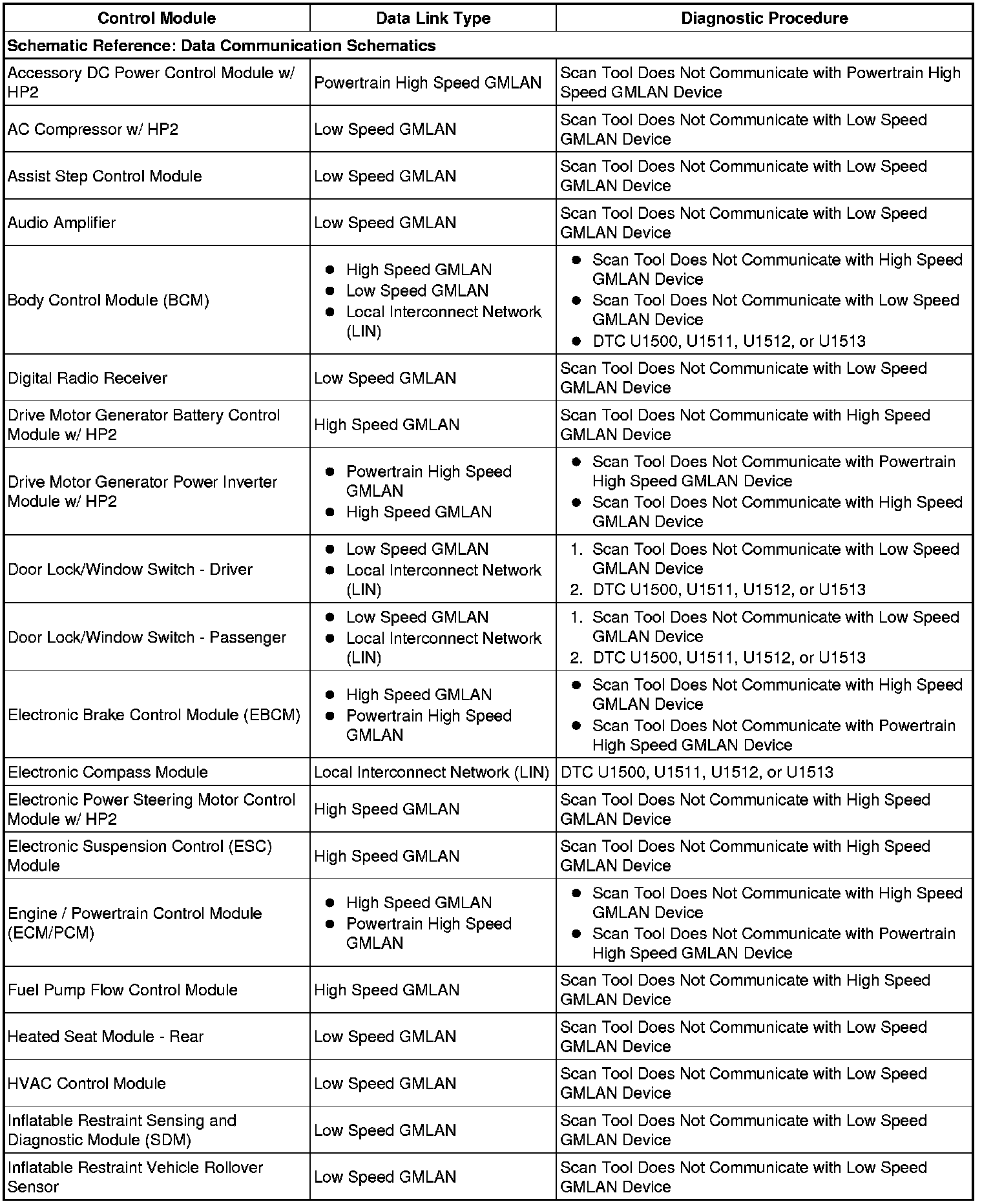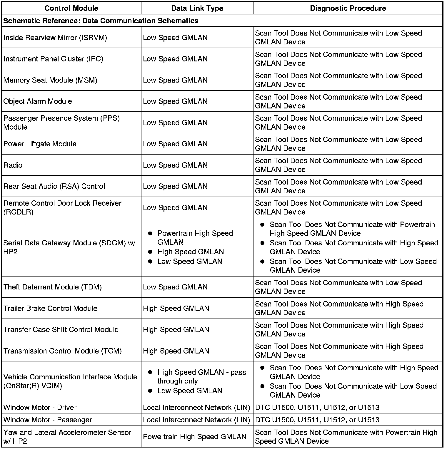 This table identifies which serial data link that a particular module uses for in-vehicle data transmission. Some modules may use more than one data link to communicate. Some modules may have multiple communication circuits passing through them without actively communicating on that data link. This table is used to assist in correcting a communication malfunction. For the description and operation of these serial data communication circuits refer to Data Link Communications Description and Operation Description and Operation.