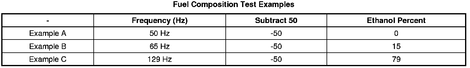 2. Subtract 50 from the reading on the DMM in order to obtain the percentage of alcohol in the fuel sample. Refer to the examples in the Fuel Composition Test Examples table.