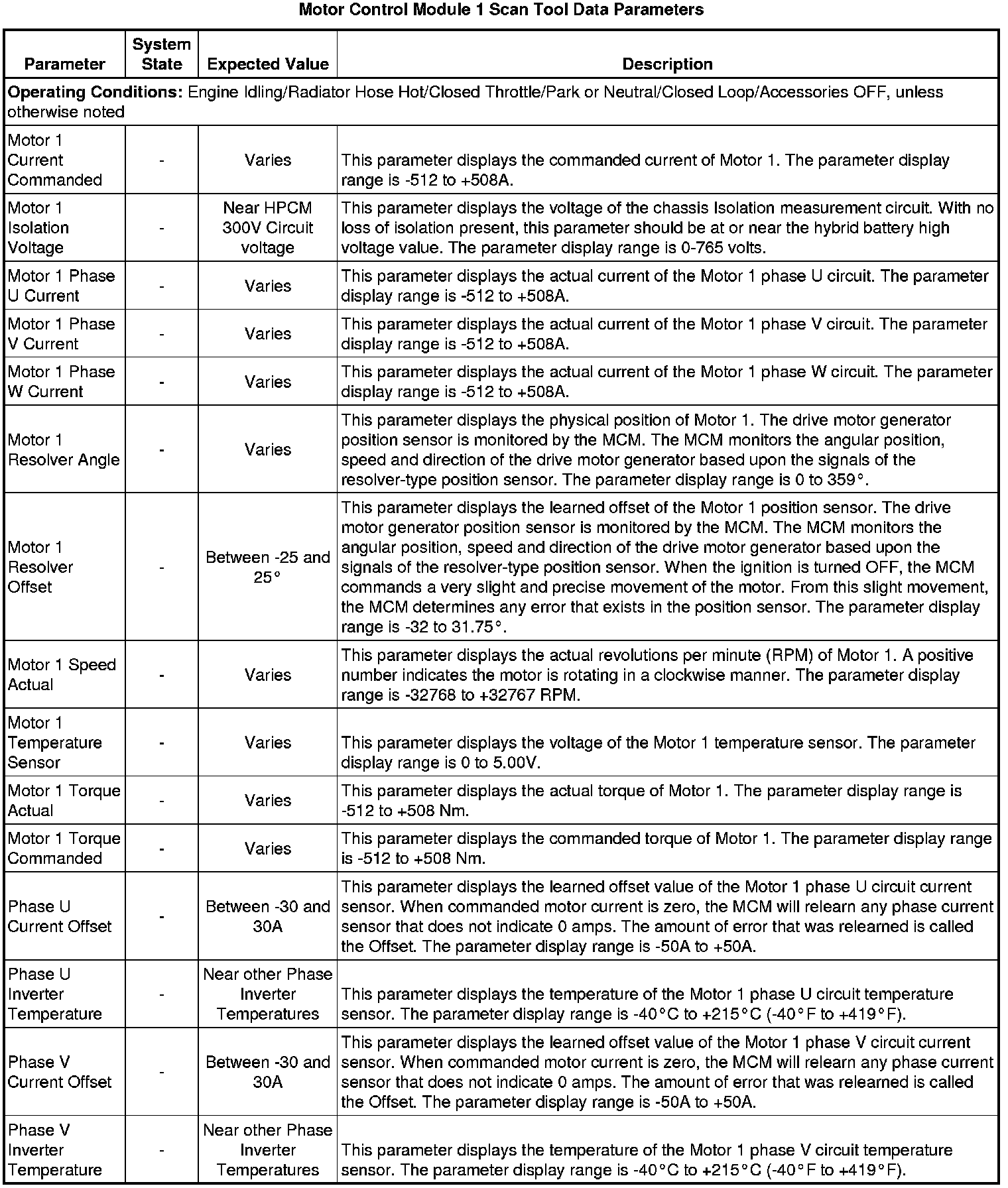 The scan tool values from a properly running vehicle may be used for comparison with the vehicle you are diagnosing. The Motor Control Module 1 Scan Tool Data Parameters list represents values that would be seen on a normally running vehicle.