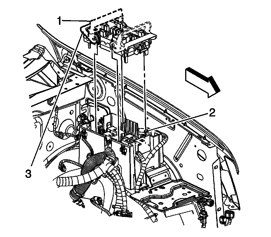9. Position and align the junction block to the 4 bracket pivots (2), once the pivots are engaged, push the retainer down into the locked position (3).