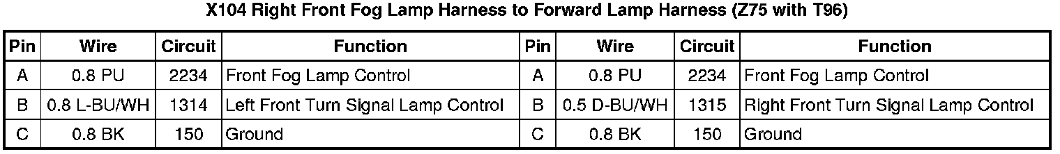 X104 Right Front Fog Lamp Harness to Forward Lamp Harness (Z75 with T96)