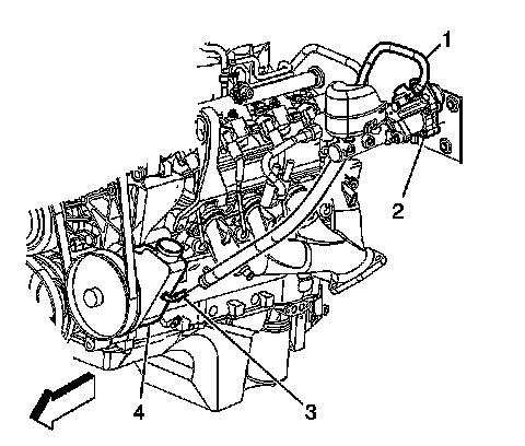4. Disconnect the power brake booster outlet hose (1) from the power steering fluid reservoir (3).