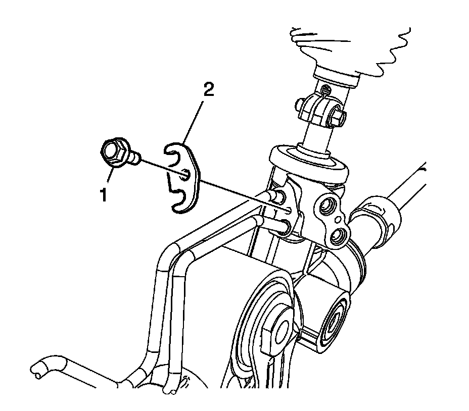 9. Install the power steering gear inlet hose retaining plate (2) and the power steering gear inlet hose retaining plate bolt (1).