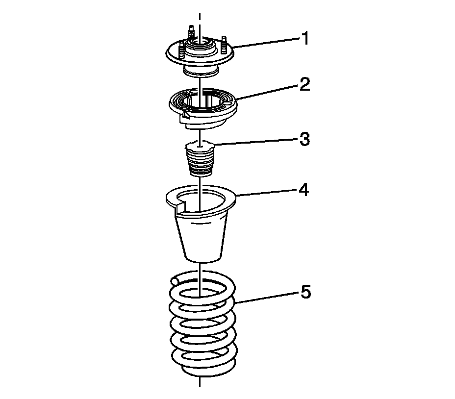 1. Assemble the front suspension strut mount (1), front spring upper seat (2), front suspension strut bumper (3), front spring upper insulator (4), and the front suspension spring (5) in the spring compressor.