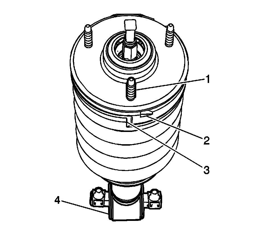 2. Align the spring seat stop (3), the outboard stud (1), and the center of the lower strut mount (4). The notch in the spring seat (2) should be just to the right of the outboard stud.