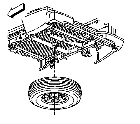 2. Rotate the hoist shaft counterclockwise in order to lower the spare tire to the ground. Continue to rotate the shaft until the spare tire can be pulled out from under the vehicle and removed. If the spare tire does not lower to the ground, the secondary latch is engaged causing the tire not to lower.