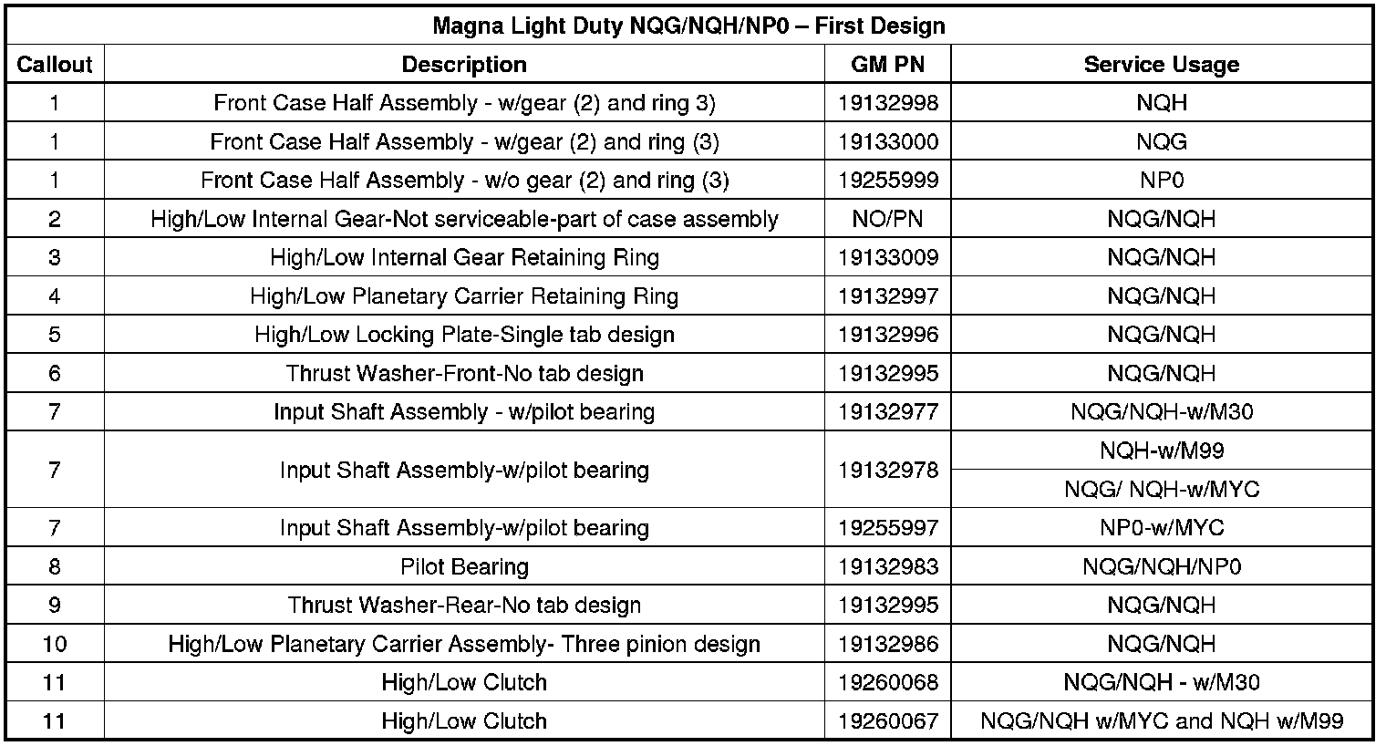 Interim 2012 model year for Magna light-duty and heavy-duty transfer case RPOs NQF / NQG / NQH, a second-design front case half assembly, planetary internal gear, gear retaining ring, locking plate, thrust washer-front, input shaft, pilot bearing, thrust washer-rear, high/low planetary carrier and high/low clutch were implemented into second-design assemblies.