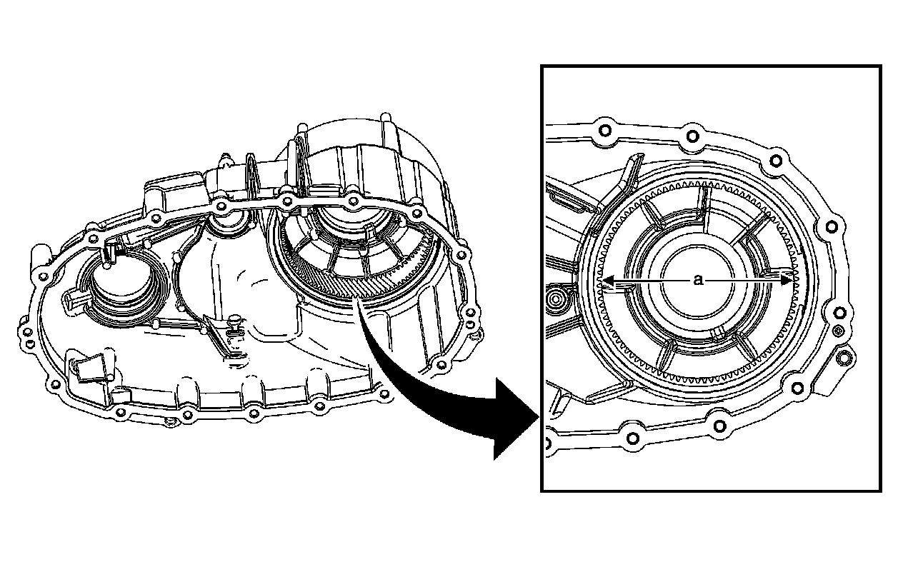 The first design front case half assembly can be identified as having an internal gear that is a 94 tooth design with an inside diameter (a) of 148.5 mm (5.85 in).
