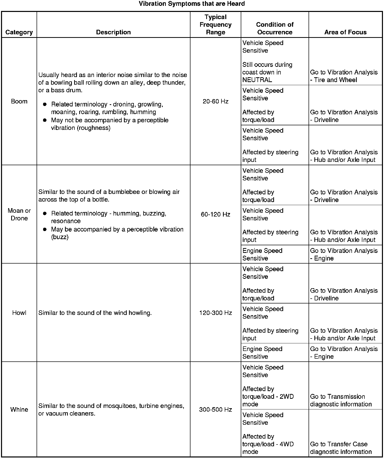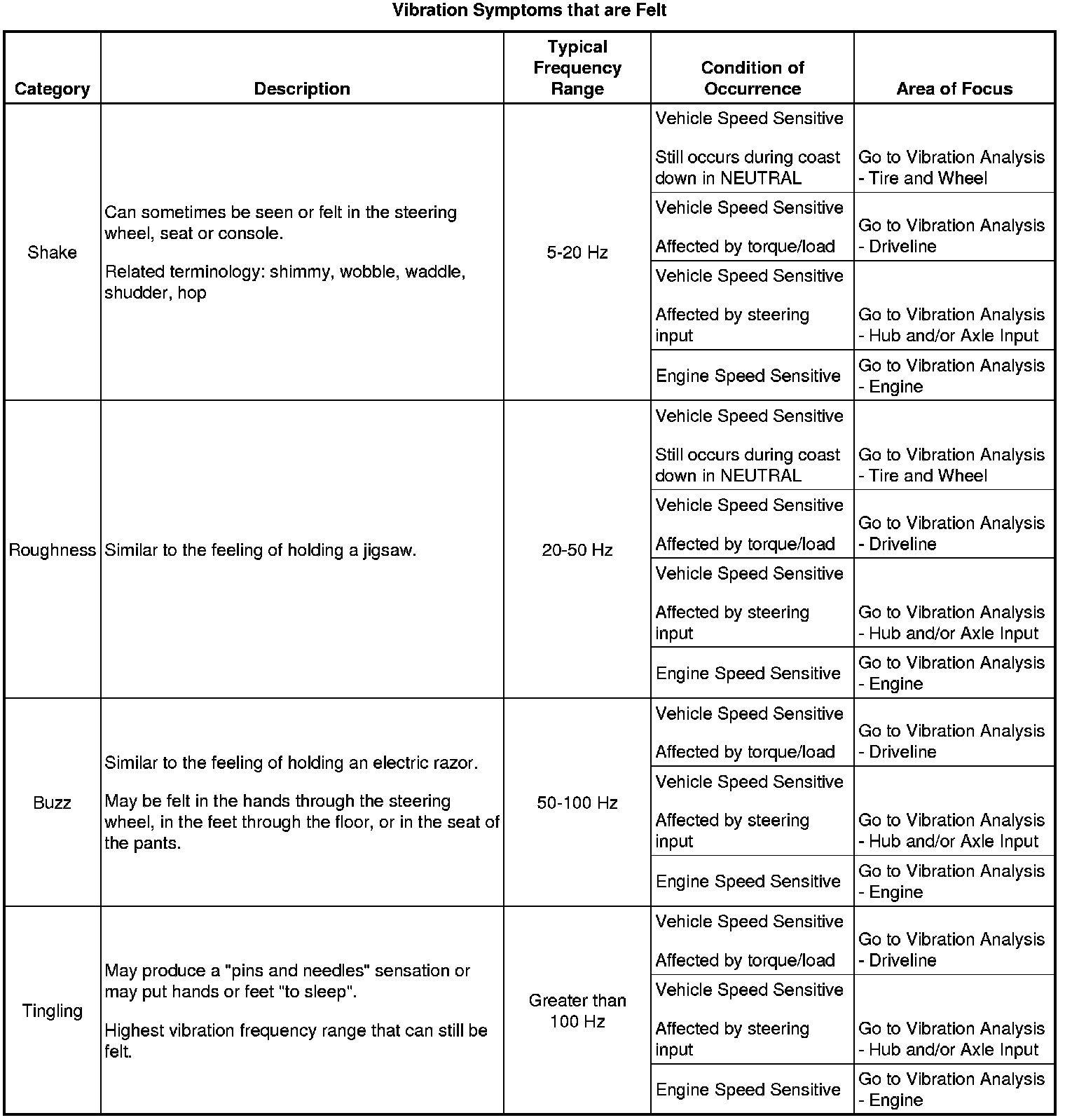 Refer to a Vibration Analysis table as indicated in the following symptom tables, based on the most dominant characteristic of the customer's vibration concern, felt or heard, that is evident during the appropriate condition of the occurrence.