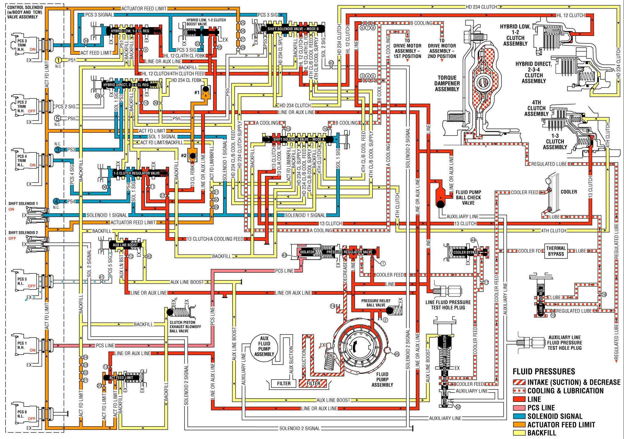 Solenoid 1 signal fluid passes through the hybrid direct, 2-3-4 clutch regulator valve into the PS3 fluid passage. PS3 fluid opens the normally closed #3 pressure switch, signaling the TCM that the transmission is in Drive Range - First Gear.