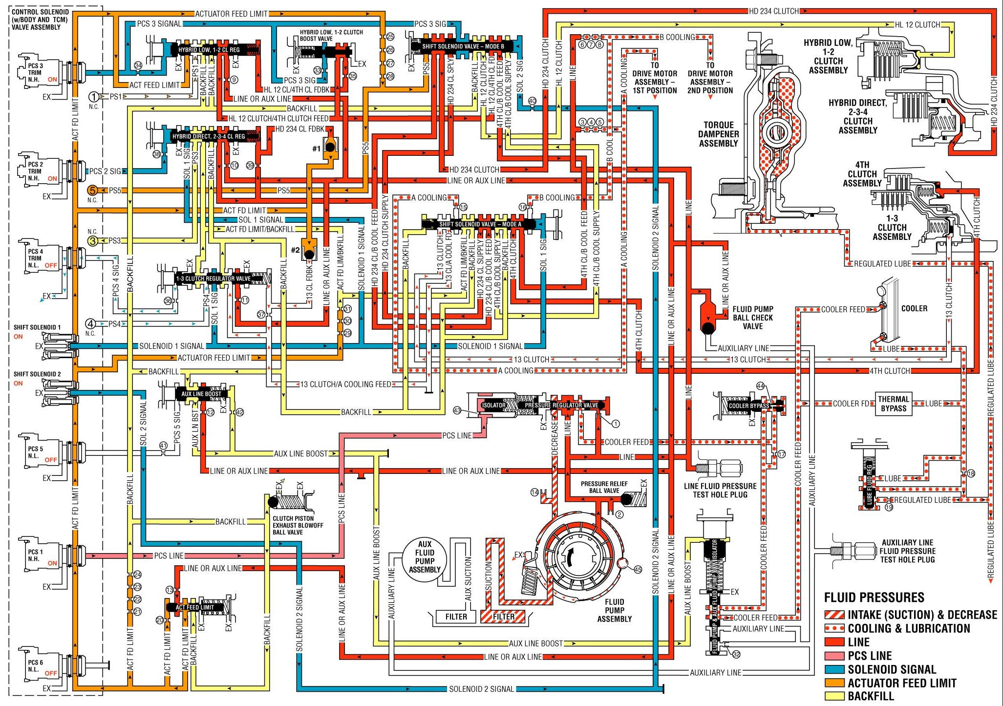 PCS 3 signal fluid, at the hybrid low, 1-2 clutch regulator valve, opposes hybrid low, 1-2 clutch regulator valve spring force and HL 12 clutch/4th clutch feedback fluid pressure to regulate line or auxiliary line pressure into the HL 12 clutch/4th clutch feed circuit.