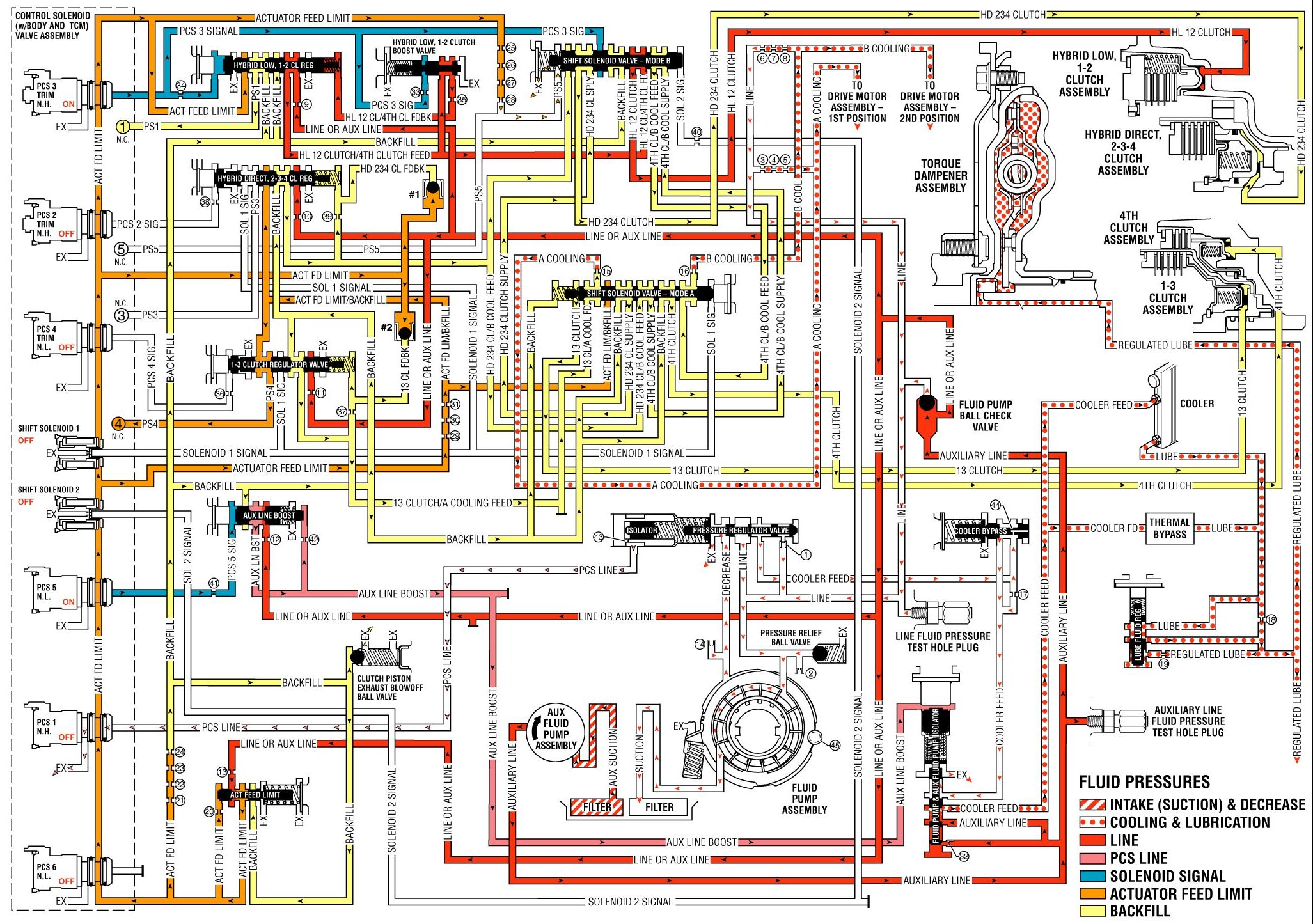 With the exception of the switch to auxiliary line fluid pressure from the auxiliary fluid pump, no other changes occur to the transmission's hydraulic system and the hybrid low, 1-2 clutch remains applied.